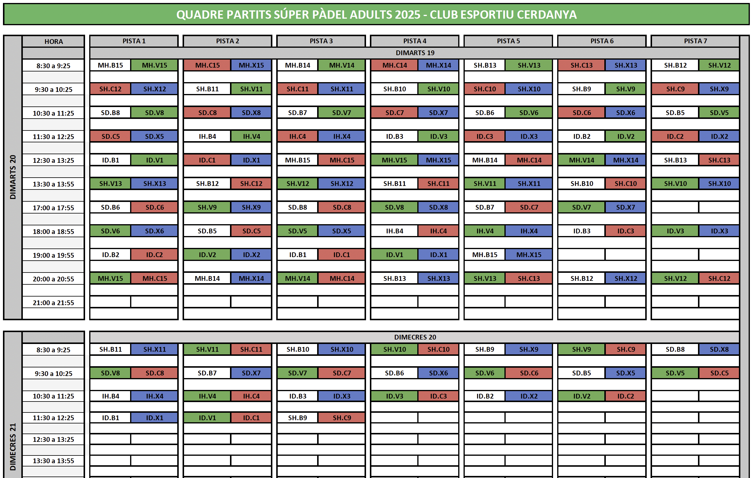 Partits: 55 minuts ⏱️, canvi de camp cada joc imparell 🔄.